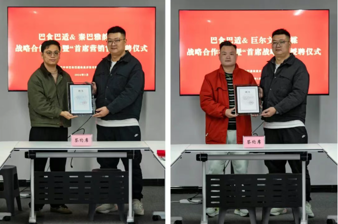 3月20日,市巴食巴適公司與四川秦巴雅韻文化發(fā)展有限公司、四川巨爾文化傳媒有限公司戰(zhàn)略合作簽約暨首席官授聘儀式在市巴食巴適公司會(huì)議室舉行。四川秦巴雅韻文化發(fā)展有限公司總經(jīng)理李泓江受聘擔(dān)任“首席營(yíng)銷(xiāo)官”(CMO),四川巨爾文化傳媒有限公司運(yùn)營(yíng)總監(jiān)郭有成受聘擔(dān)任“首席戰(zhàn)略官”(CSO)。此次雙簽約、雙授聘,標(biāo)志著“巴食巴適”品牌建設(shè)在文化賦能與戰(zhàn)略傳播兩個(gè)維度同步發(fā)力,邁入?yún)f(xié)同發(fā)展新階段。